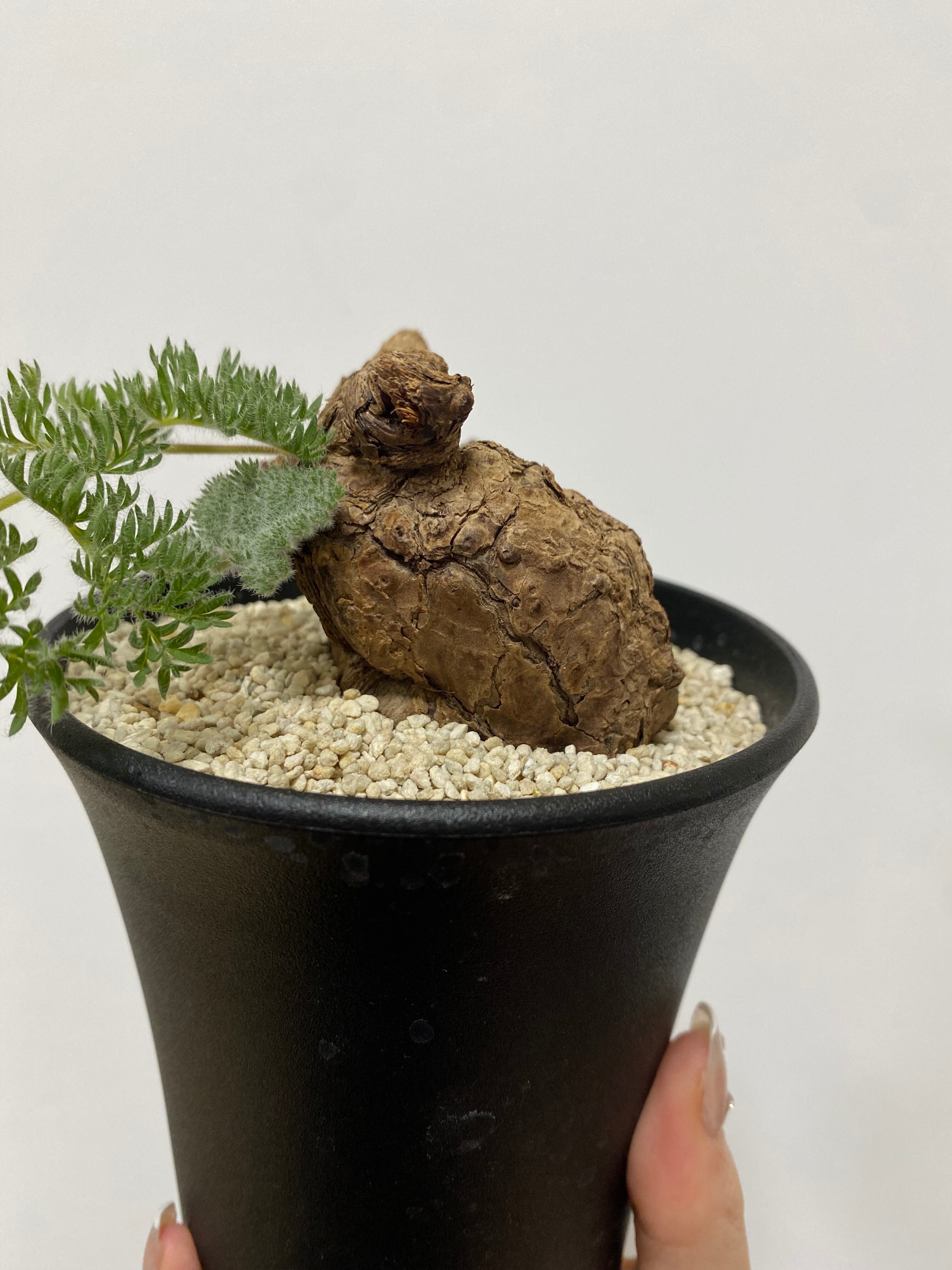 樹木の様な肌を持つ塊根から、産毛の生えた美しい葉を伸ばす冬型の塊根植物、ぺラルゴニウム・トリステ。非常に人気の高い小型の品種です。