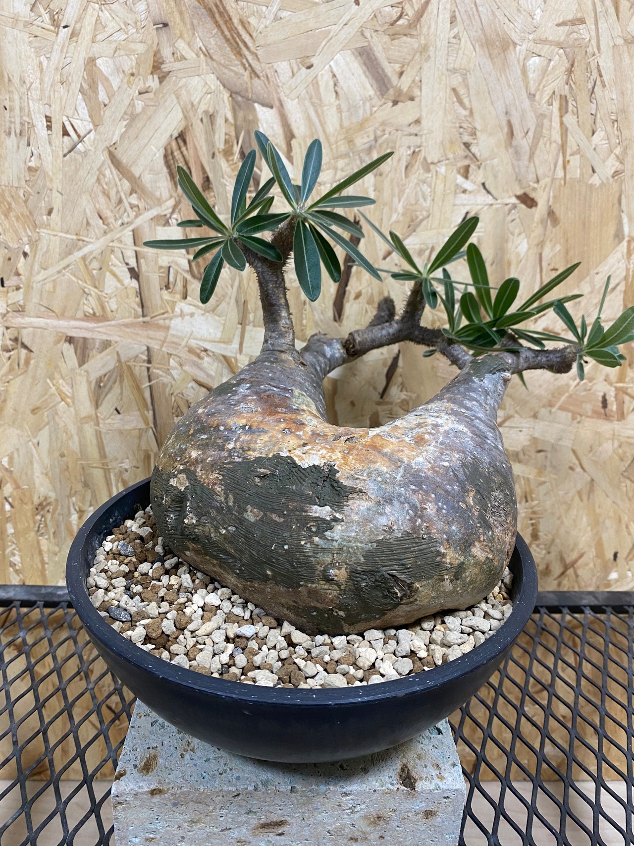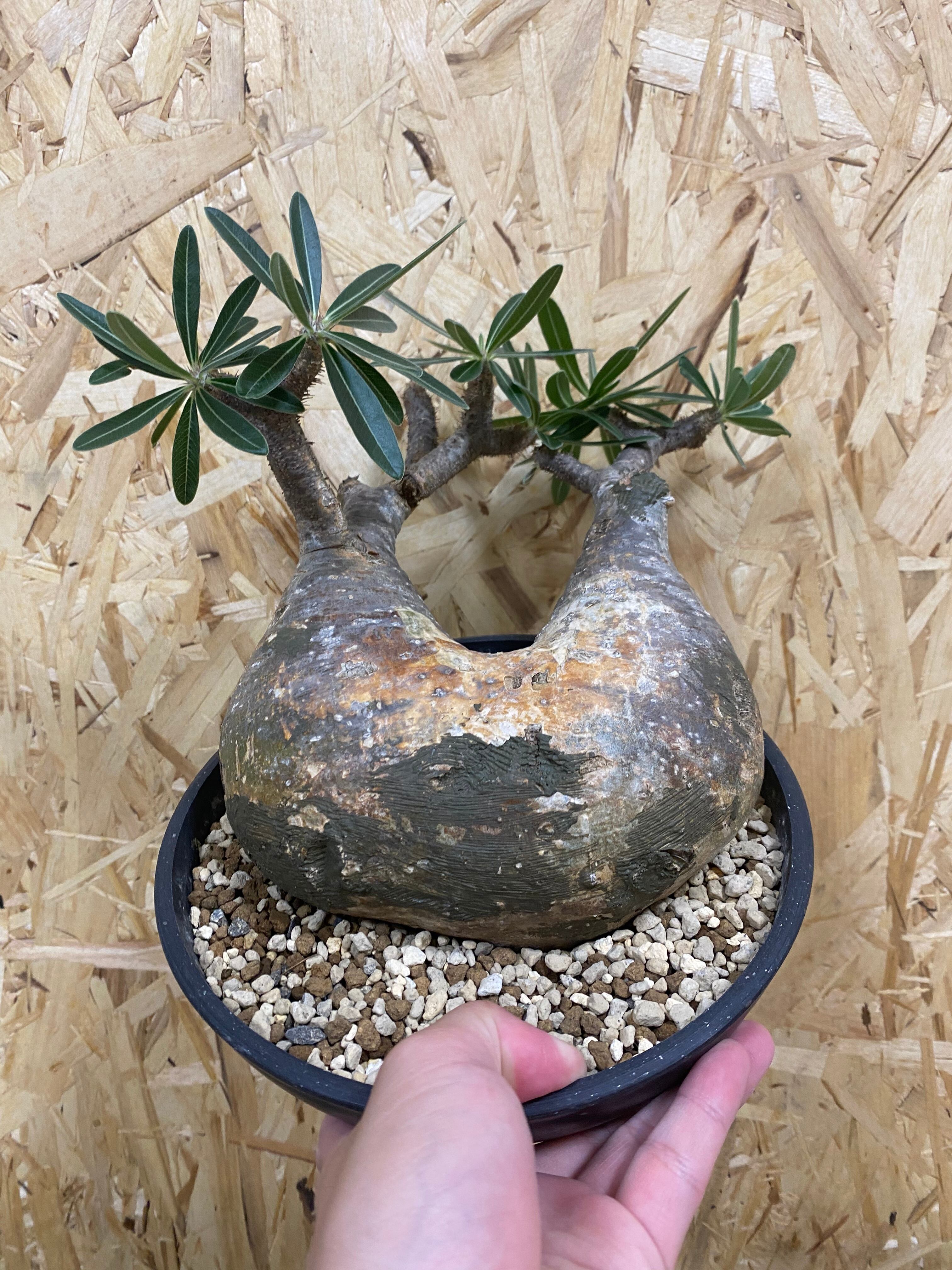 コーデックスの中でも人気の高いパキポディウム属。パキポディウムの中でも最も人気のある種のひとつ。他の種に比べて葉が細く、塊茎が太くなります。